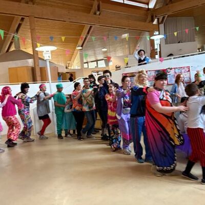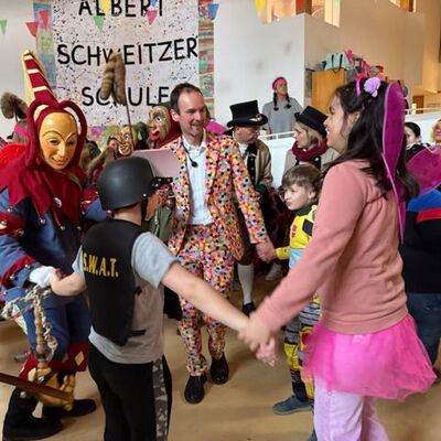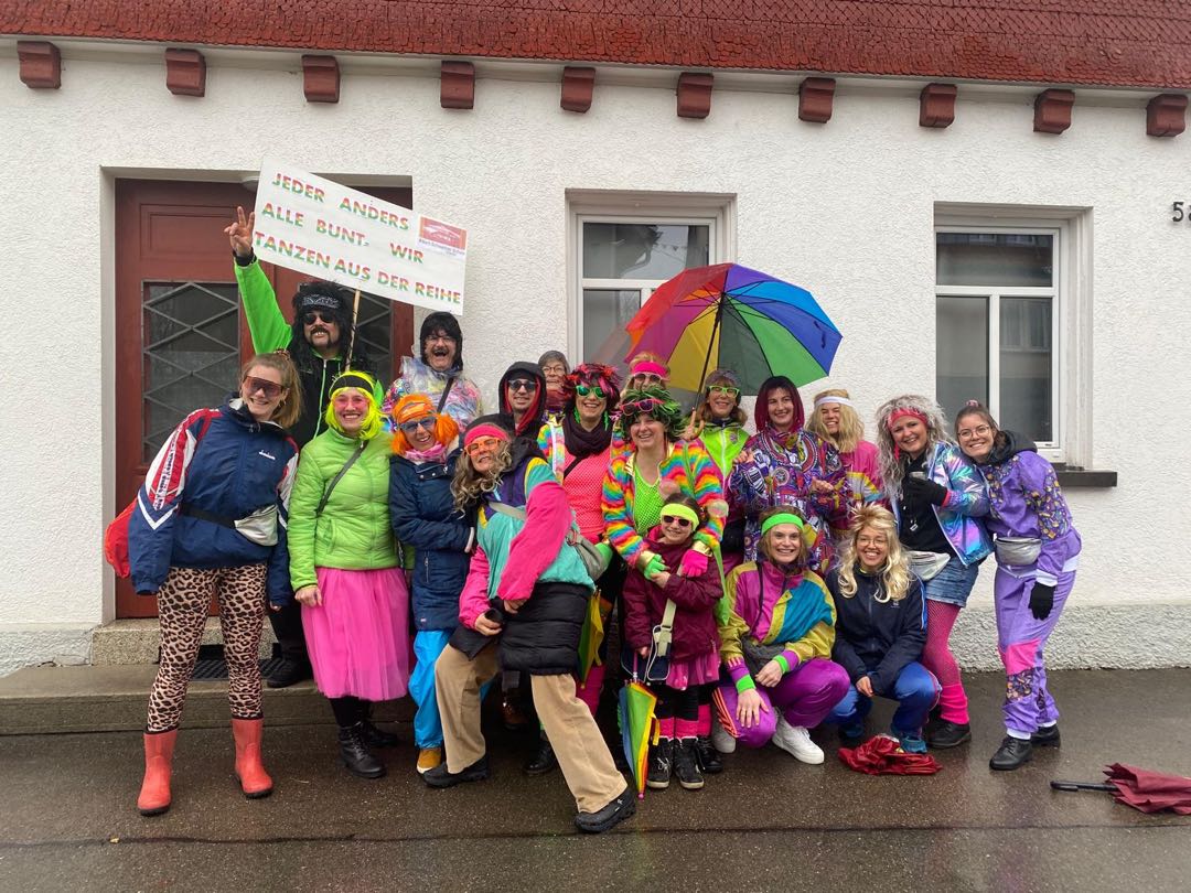 Am Gumpigen Donnerstag herrschte an unserer Schule eine fröhliche und bunte Stimmung. Alle Kinder durften verkleidet in die Schule kommen und starteten den Tag mit einem gemütlichen Frühstück in ihren Klassen. Anschließend trafen sich alle Schülerinnen und Schüler in der Aula. Dort wurde gemeinsam zu vielen bekannten Fasnetsliedern getanzt und gefeiert. Die Stimmung war ausgelassen und die Atmosphäre sehr herzlich. Ein besonderer Höhepunkt war – wie jedes Jahr – der Besuch der Narrenzunft und des Musikvereins Kißlegg. Mit viel Musik und guter Laune befreiten die Narren die Schülerinnen und Schüler und nahmen dabei sogar unseren Chef symbolisch fest. Nach dem Besuch der Narren gab es für die Kinder verschiedene Angebote, passend zu ihren Bedürfnissen: Im Discoraum konnten die älteren Schülerinnen und Schüler tanzen, im Musikraum wurden angeleitete Tänze gemacht und im Turnraum fanden ruhige Spiele für Kinder statt, die etwas mehr Ruhe brauchten. Am Ende des Vormittags verabschiedeten sich die Kinder gut gelaunt in die Ferien. Vor dem Umzug stärkten sich die Lehrkräfte bei einem gemeinsamen Mittagessen im Restaurant Ochsen. Danach liefen viele Lehrkräfte zum ersten Mal gemeinsam beim traditionellen Umzug am Gumpigen Donnerstag mit – unter dem Motto „Kunterbunt“ und passend gekleidet im Stil der 80er-Jahre. Trotz des regnerischen Wetters war die Stimmung großartig und alle hatten viel Freude.